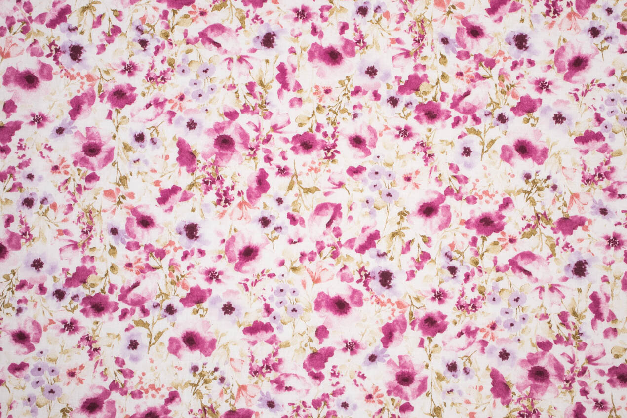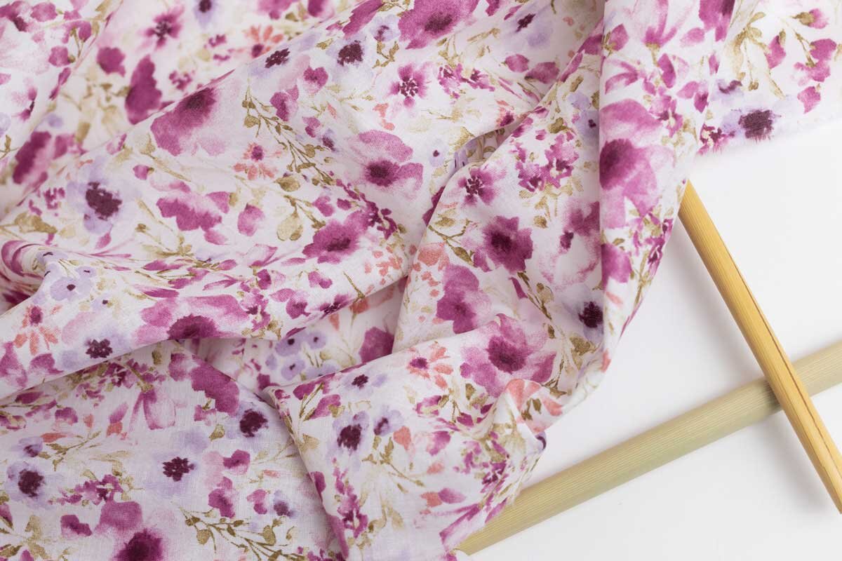 Flownny 6 from the Japanese fabric house Kokka is a gentle, forthright print bursting with watercolor flowers in magenta and lilac tones. The result evokes a summer garden in full bloom.